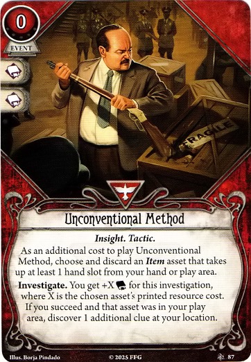 However, this card has one great use. It is an incredible Scavenging enabler. While it won't give you back resources like Act of Desperation, you can play Unconventional Method, discard the asset that you want to loop, investigate with a bit bonus, and then if you have enough resources and succeed by 2, you can play the same asset that you discarded all in the same action. Minh Thi Phan + The Necronomicon, anyone? (Edit: Well, this part aged like fine milk.)